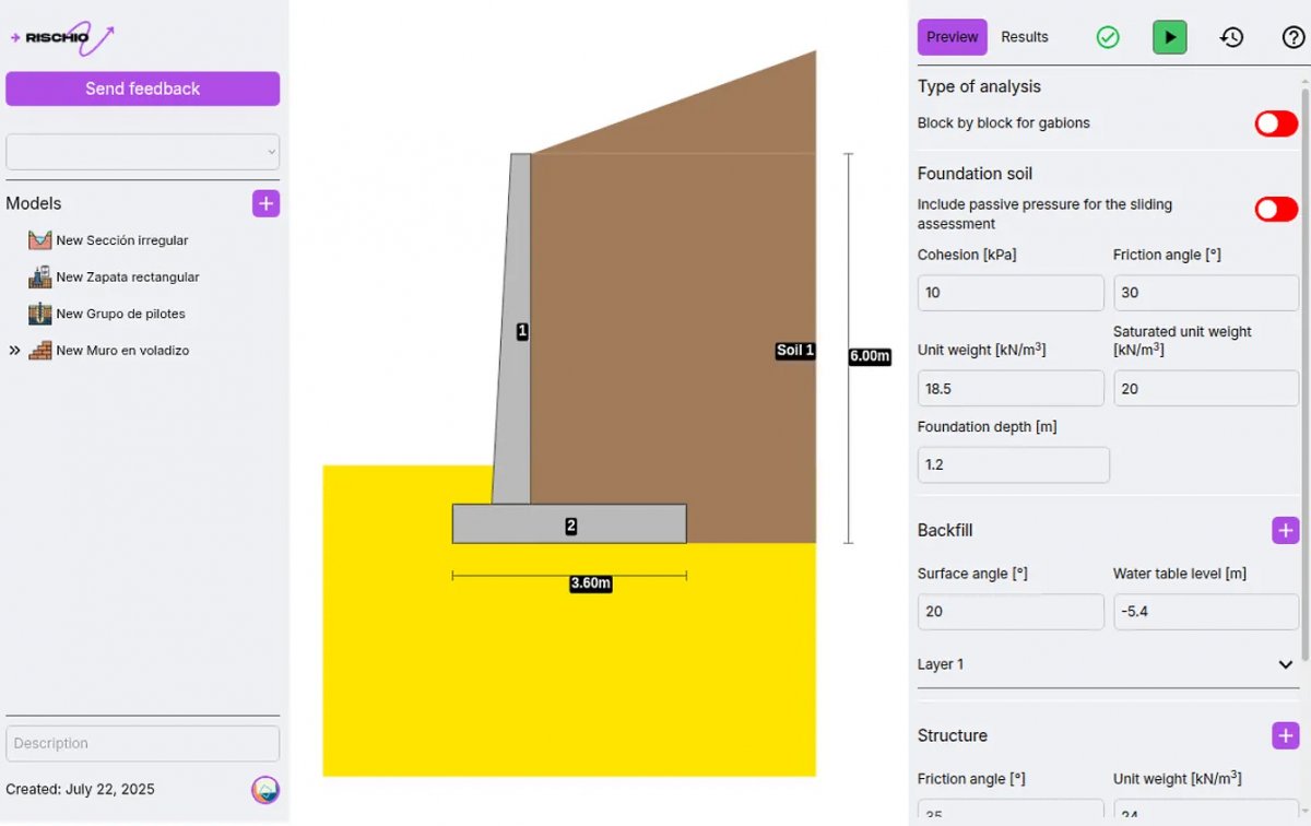 Rischio is a specialized cloud-based (SaaS) engineering platform designed to streamline complex geotechnical and hydraulic calculations. Unlike general-purpose CAD software, Rischio focuses on providing precise, automated tools for civil engineers to design infrastructure components like retaining walls and foundations with high technical accuracy.